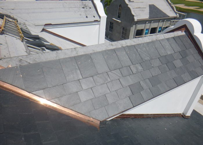 In early 2017 we finished this slate roof in Bay Colony of Pelican Marsh. The product is Buckingham Black 3/8″, all 20 oz. copper flashings, over Certainteed SA CAP self adhered directly to the plywood.
